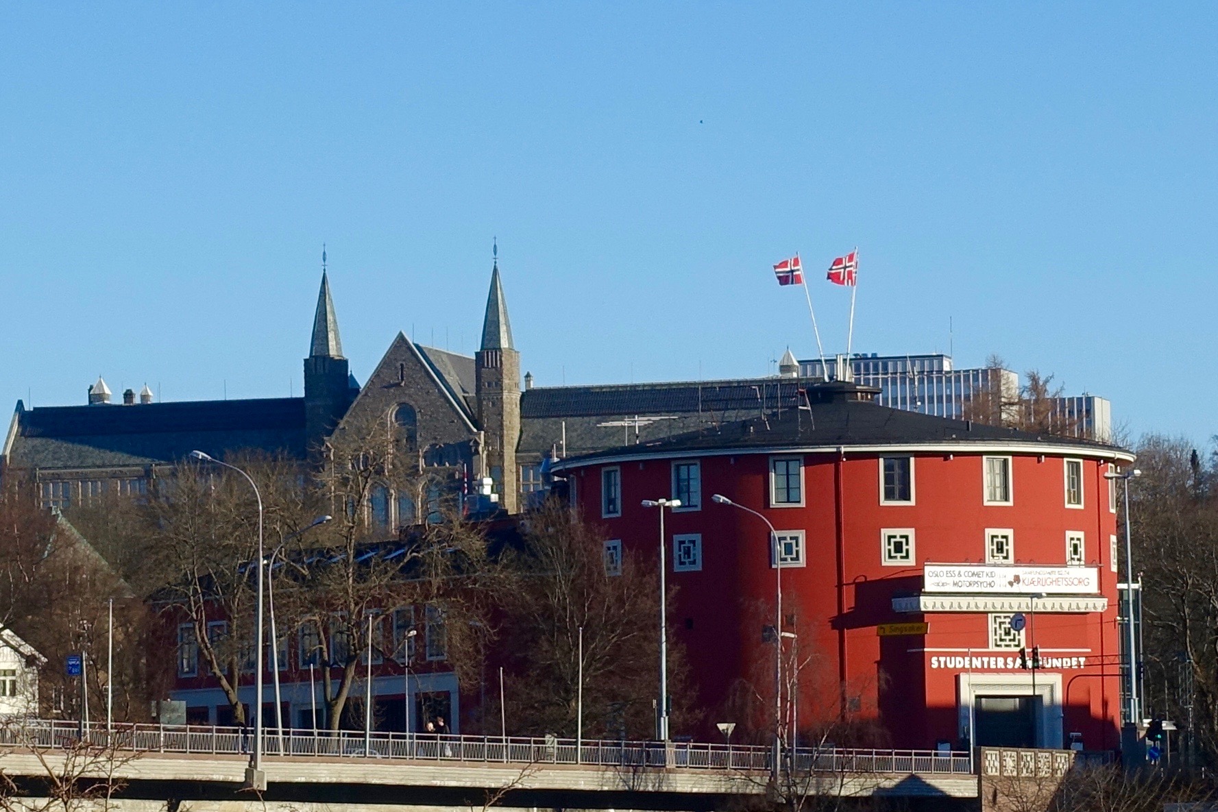 The Norwegian flag waving from the rooftop of Studentersamfundet.