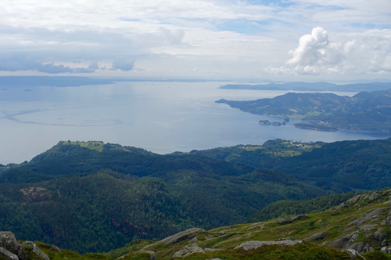 View from Brurasåta towards Baldersheim and Bjørnefjorden. The farms on the left is called Kleppe, on the right Selsvold.
